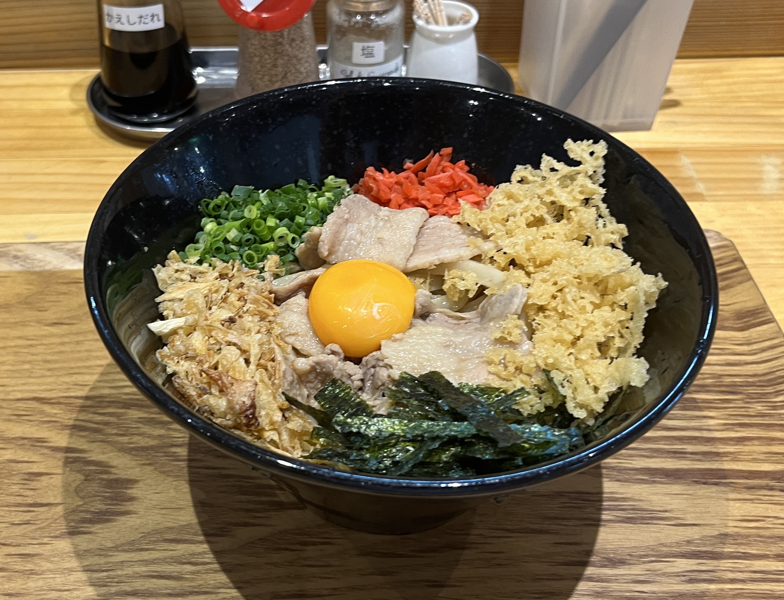 ジャンク系ラーメンの発想を取り入れた、ガッツリ系うどんで個人的にめちゃめちゃ好きな雰囲気です。5分程で出てきました。よく混ぜ混ぜしてからいただきます。麺はグレーがかった色味でかなりコシが強くワシワシ感満載。具材は豚バラ、葱、刻み海苔、ガーリックチップ、天かす、紅生姜などが入っていて濃すぎずバランスが良く想像以上に美味しかった♪