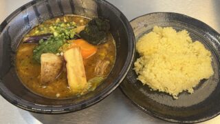 埼玉県川越市「プラス ワン」札幌出身の店主が作る本格スープカレー店。全体的に少しお高め価格。注文した野菜7種角煮(野菜は人参、じゃがいも、キャベツ、ピーマン、さつまいも、ブロッコリー、小葱)などが素揚げされていて、香ばしくて食感も良好。