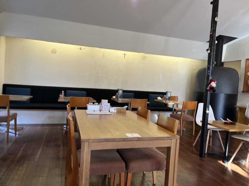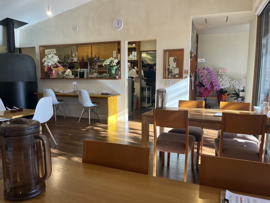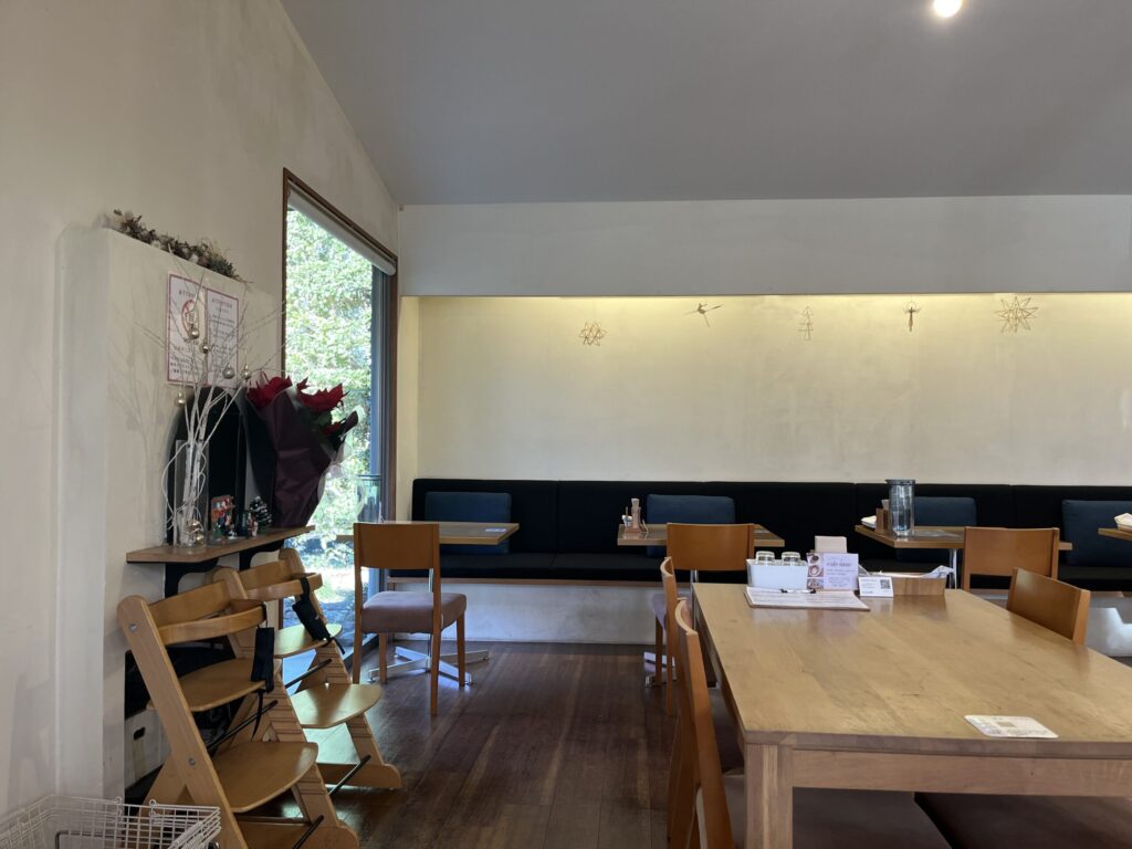 店内は木目調のテーブルや椅子を中心に、明るい色合いで統一されたインテリア。ガラス張りの入口から光が差し込み、開放感があります。