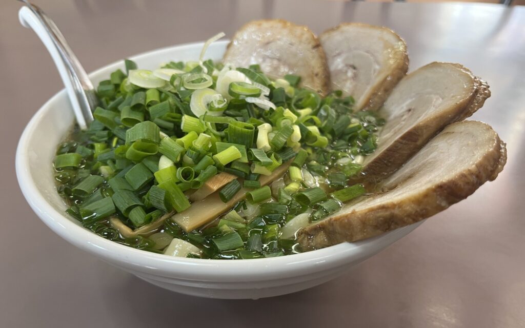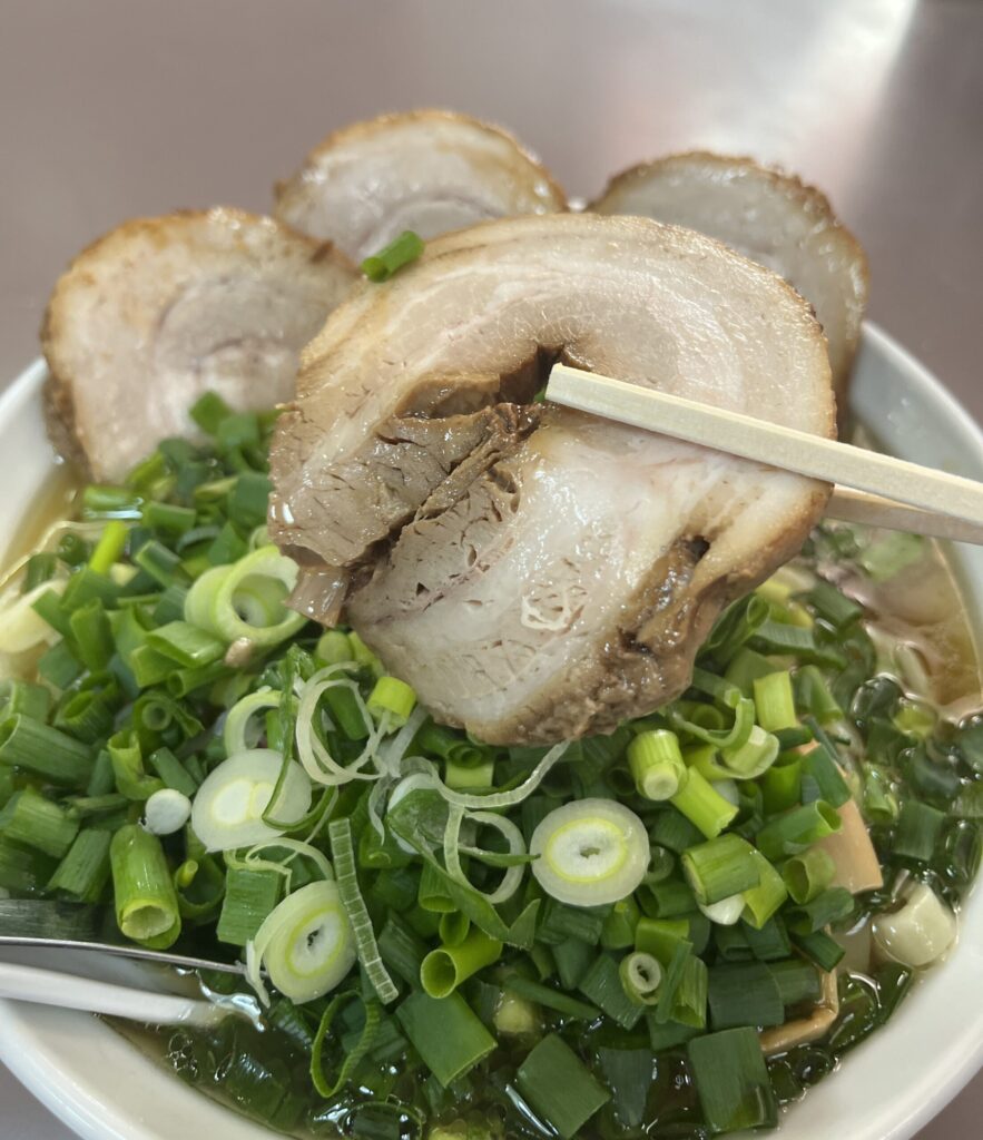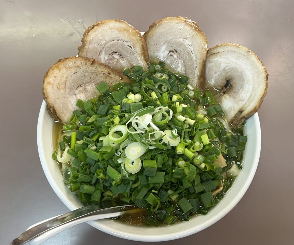 メニュー写真のボリュームに惹かれて、青ねぎチャーシューを注文しました。実際に出てくると、メニューの写真以上で青ねぎが「山盛り」で圧巻のビジュアルです。