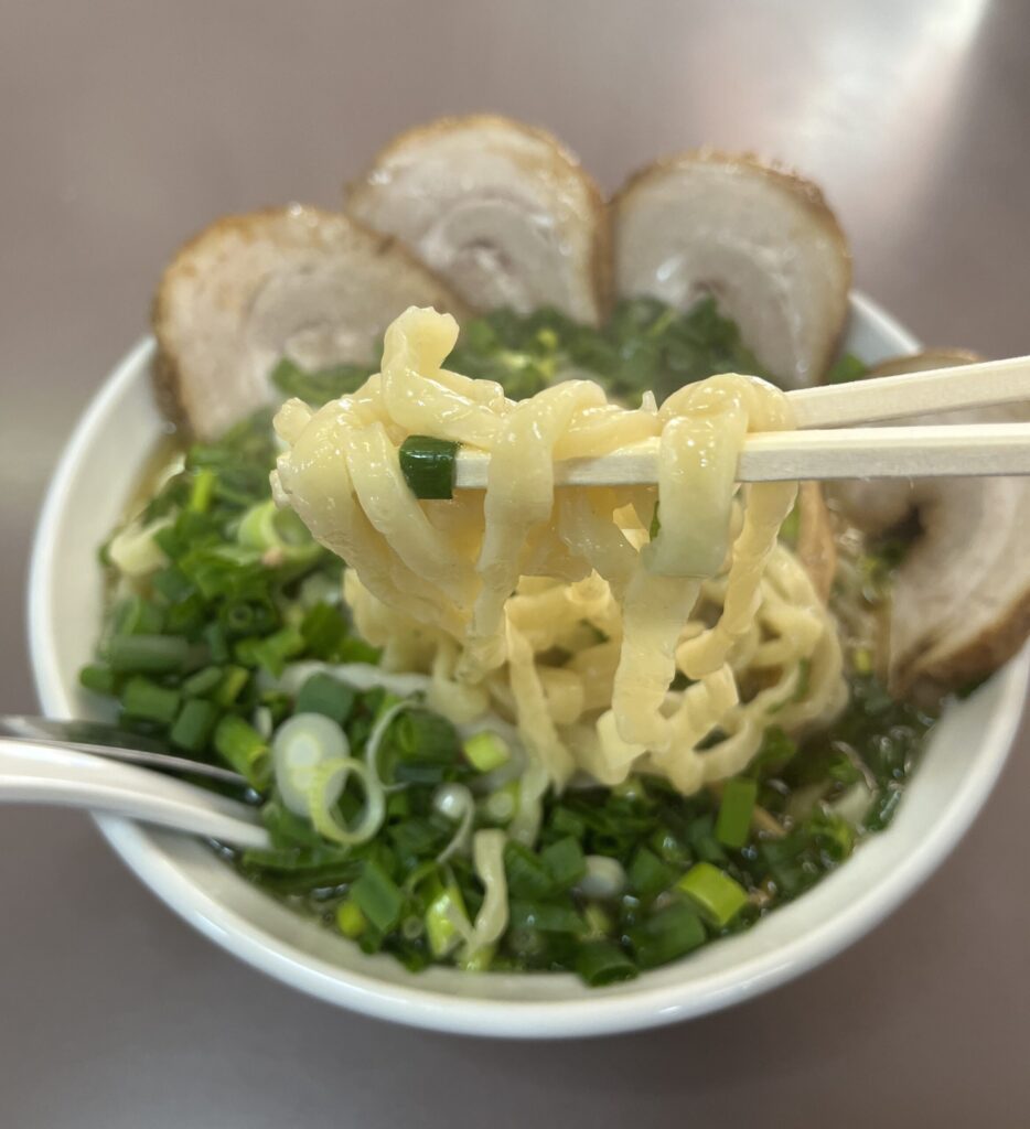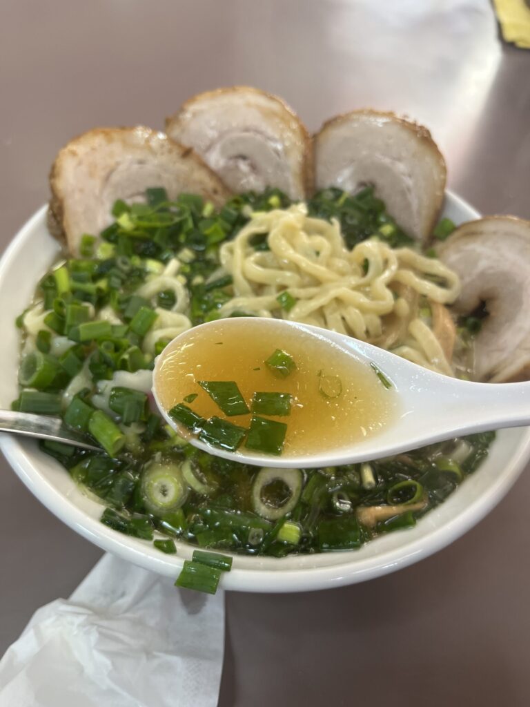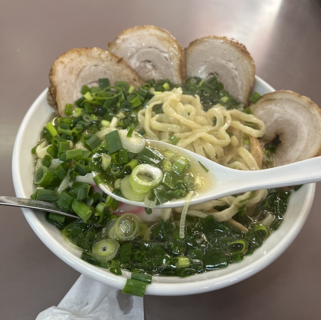具材が完全隠れる程の青ねぎは、食べ始めはシャキシャキ、スープの熱でしんなりしても美味しくいただけます。こじ開けてスープを飲むと鶏とカツオの効いたさっぱりした醤油スープでついつい飲み干したくなる美味しさ。