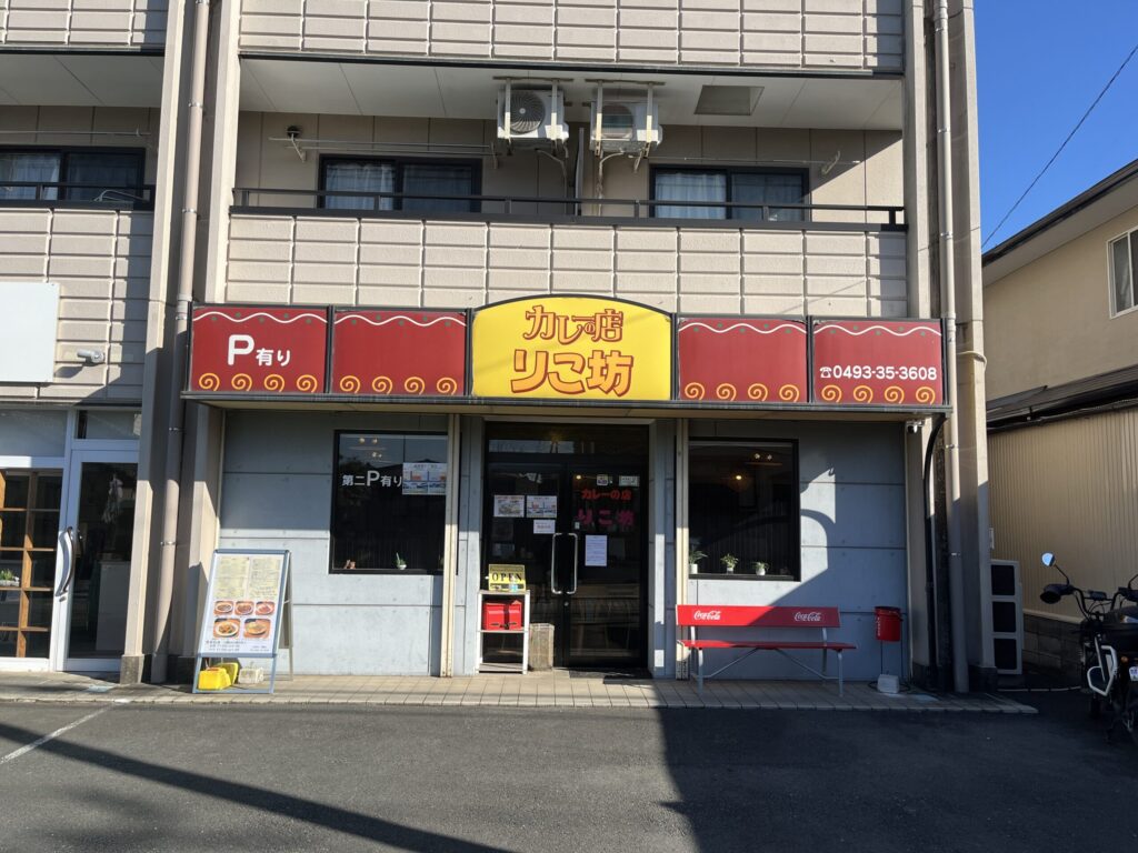 看板は黄色地に赤文字で「りこ坊」と大きく書かれており、カレー屋らしい鮮やかな配色が目立ちながらもどこかレトロな雰囲気があります。