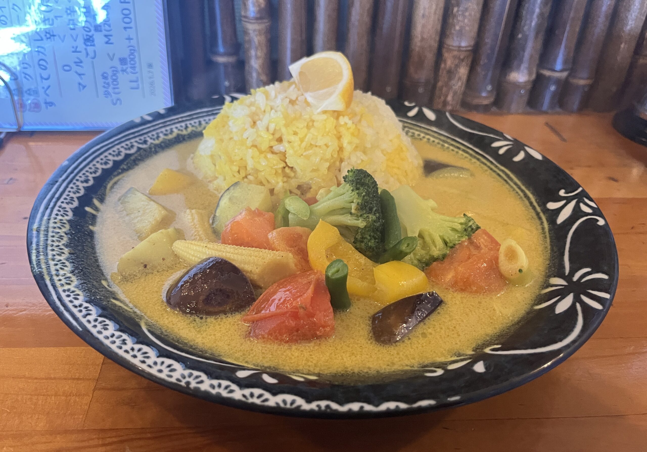 豊富なカレーのラインナップで悩みましたが、野菜のスープカレーにしました。ライスはLサイズ、辛さは1の中辛で注文です。