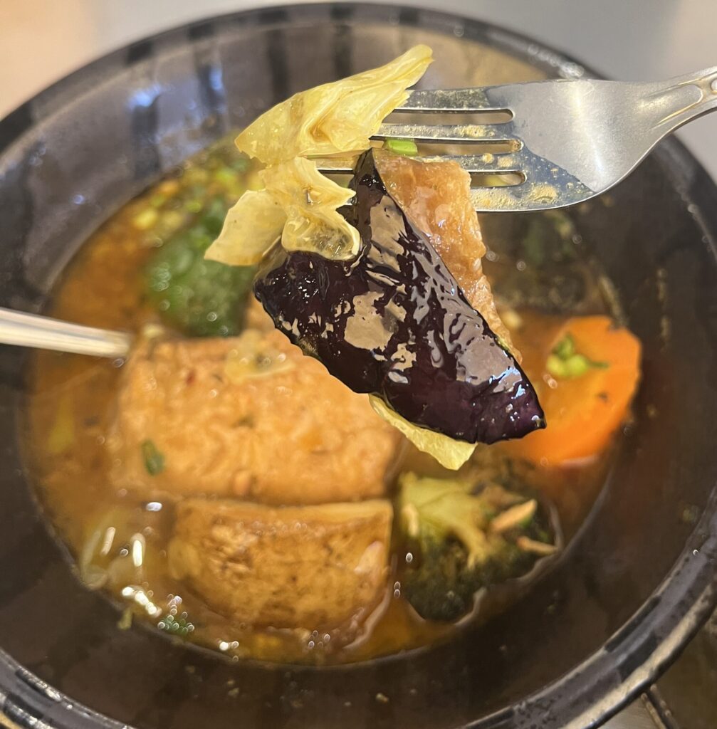 7種の野菜は人参、じゃがいも、キャベツ、ピーマン、さつまいも、ブロッコリー、小葱などが素揚げされていて、香ばしくて食感も良好。角煮は柔らかくてホロホロ、スプーンで簡単にほぐれます。