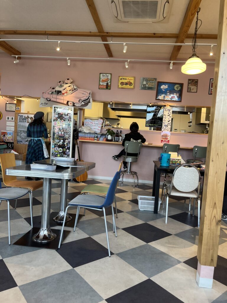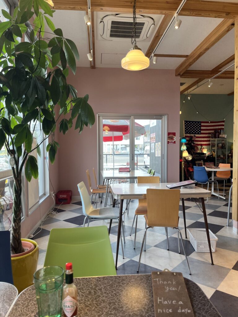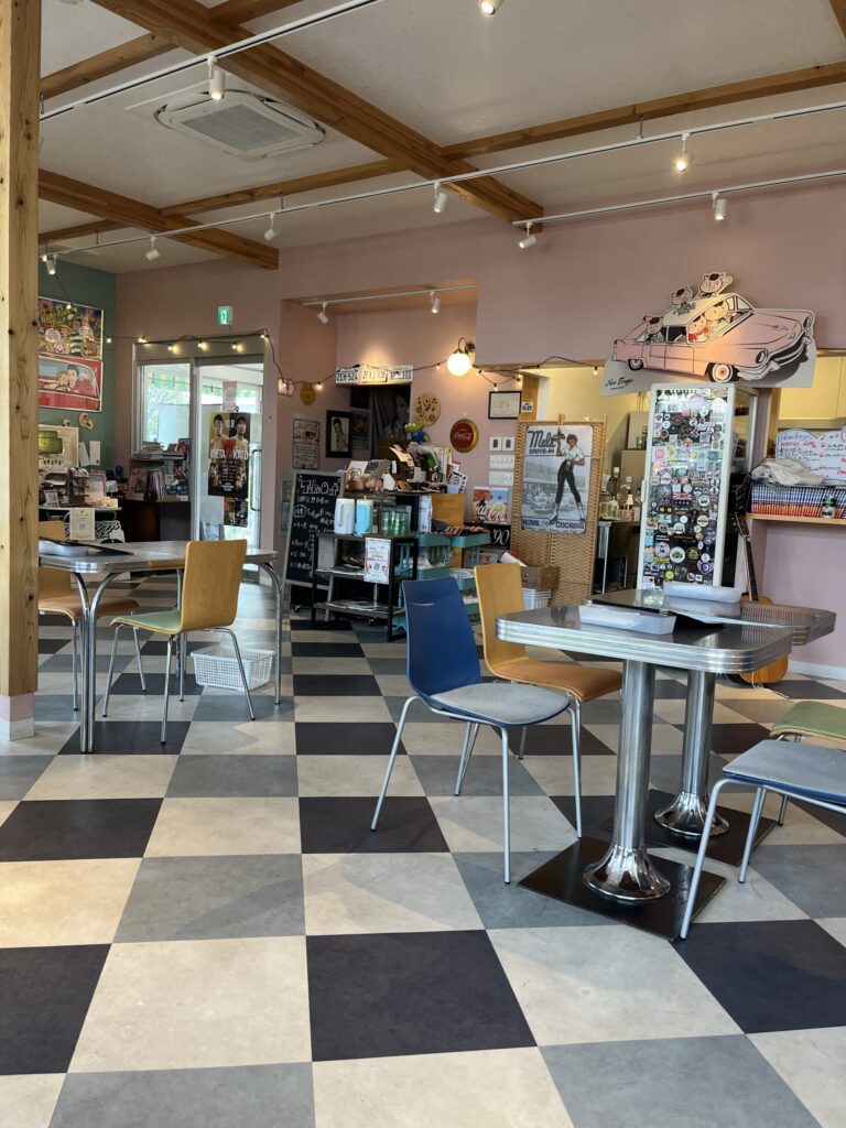 店内は、薄ピンクを基調とした壁やインテリアで、明るくポップな印象。ネオンサインやレトロ家具が並び、映画のワンシーンのような空間です。