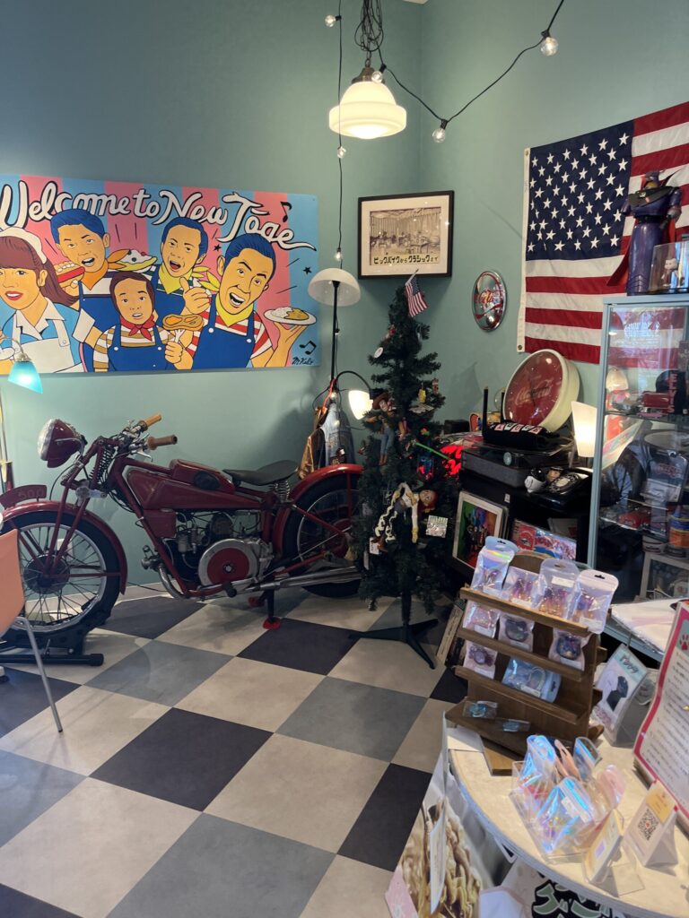 ネオンサインやアメリカン雑貨で飾られたポップな雰囲気が特徴。