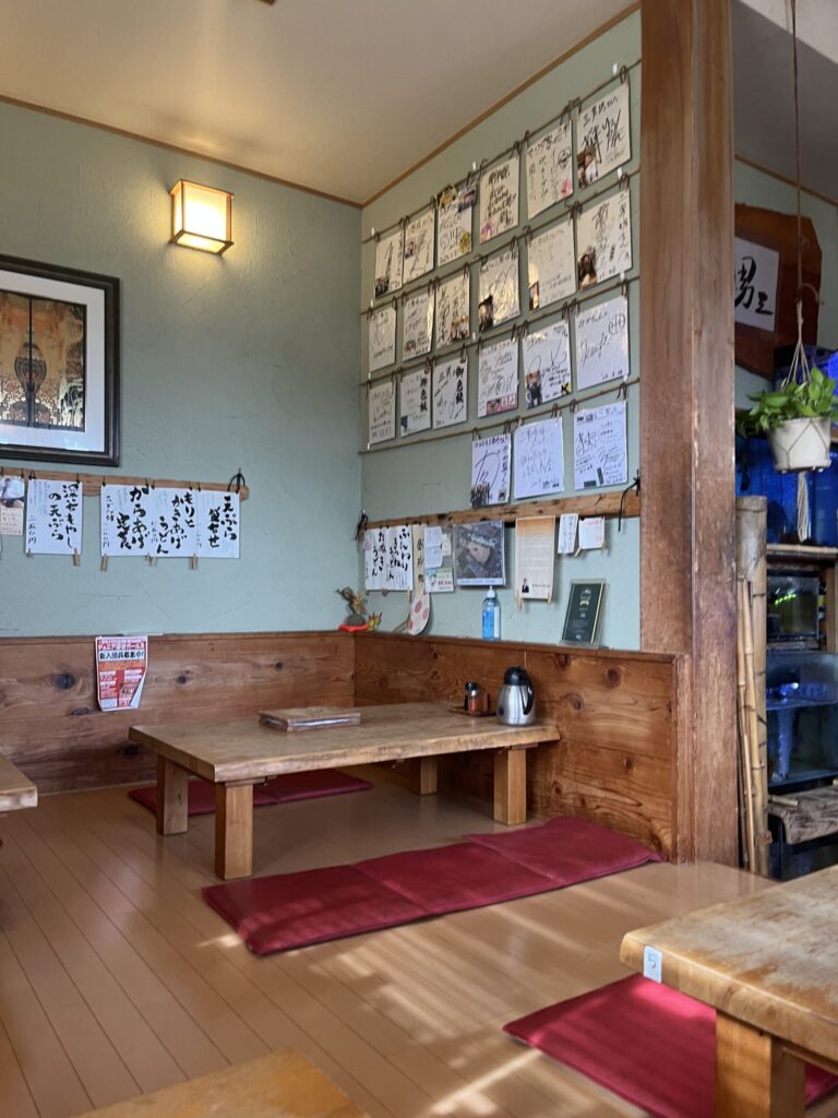 古民家風で山小屋のような雰囲気が特徴。壁には有名人のサイン色紙やテレビ取材の写真が飾られており、賑やかで親しみやすい空間です。