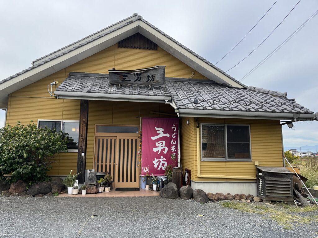 黄色い外壁に瓦屋根を備えた和風の建物で、入口には木製の格子扉とピンクや紫色ののれんに「三男坊」と書かれた文字が目に留まります。